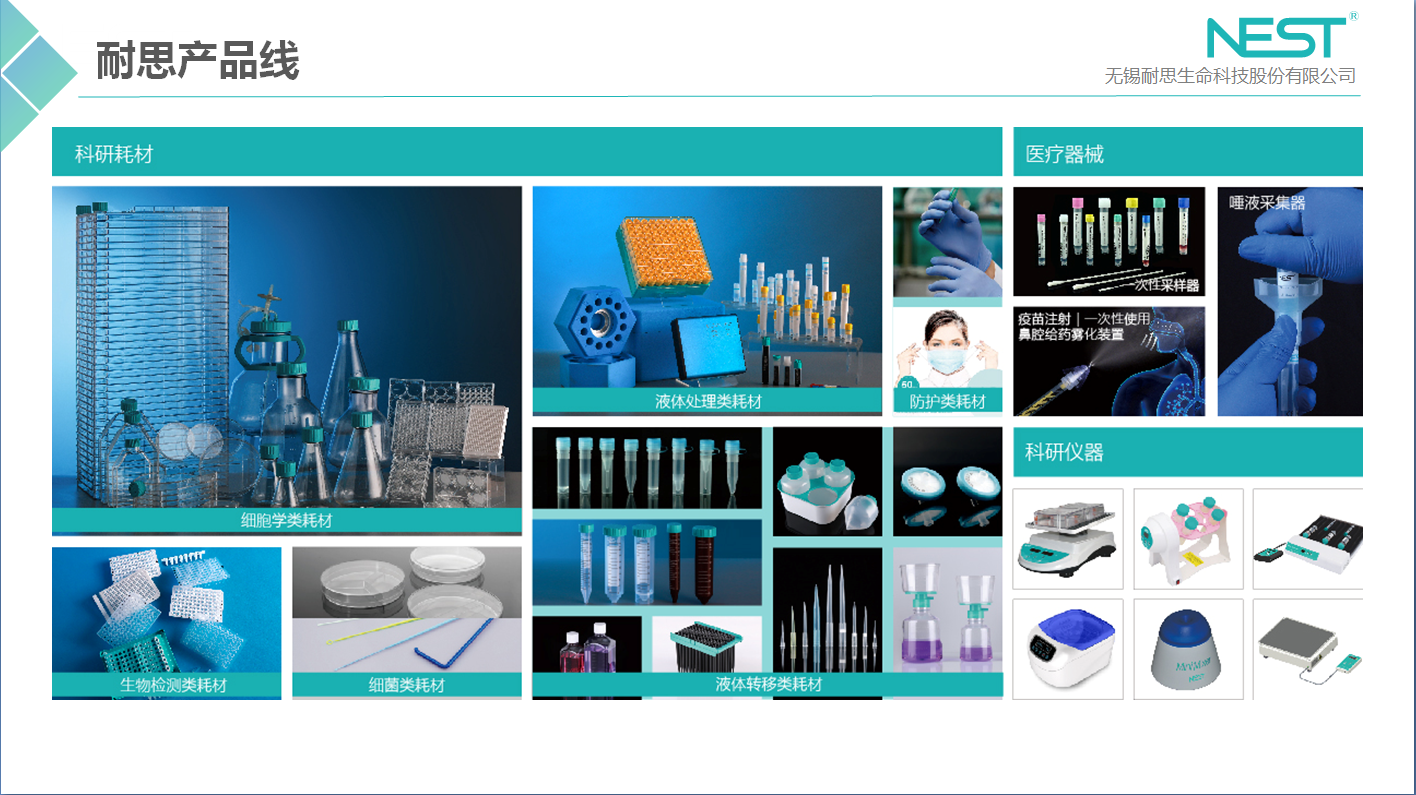 耐思NEST品牌主要產(chǎn)品分為:科研耗材、醫(yī)療器械和體外診斷三大類。耗材類根據(jù)應(yīng)用領(lǐng)域不同,可細(xì)分為六大類:細(xì)胞類耗材、液體處理類耗材、液體轉(zhuǎn)移類耗材、生物檢測(cè)類耗材、細(xì)菌類耗材、防護(hù)類耗材。