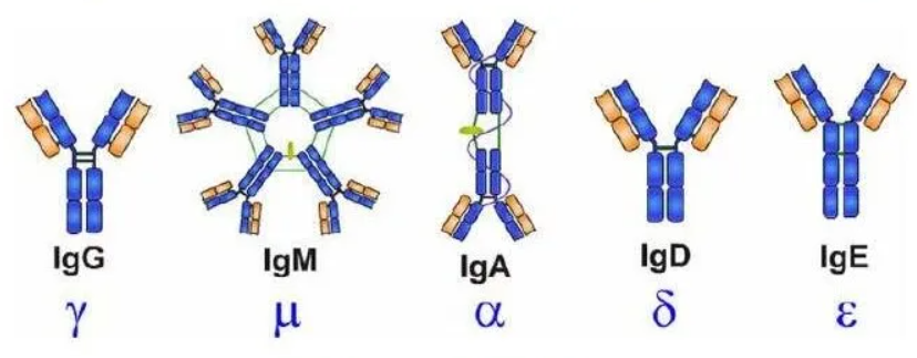 Ig由兩個輕鏈(L)和兩個重鏈(H)的單體組成。在人體中,Ig分五類,即IgG、IgA、IgM、IgD和IgE。
