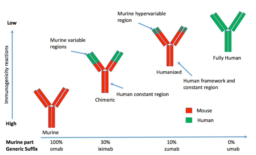雜交瘤技術生產(chǎn)的是鼠源性的單克隆抗體,用于人身上會有強烈的免疫反應,因此單克隆抗體經(jīng)歷了一段鼠源-鼠源人源嵌合體-全人源化改造的歷程。