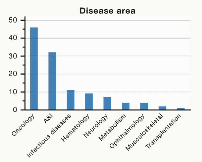 圖五:A)FDA批準的前100種抗體應用領域(2021)[4];