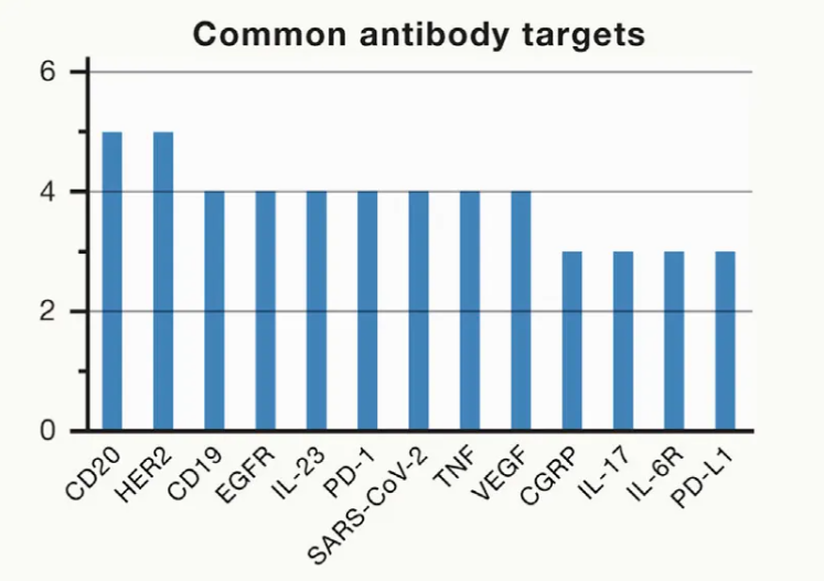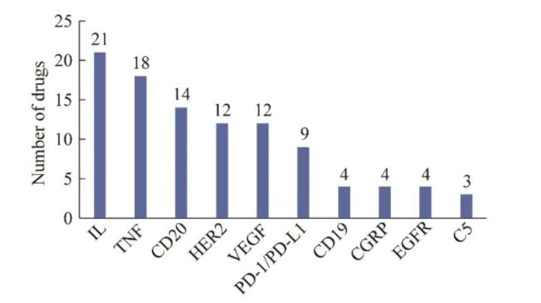 截止2024年,在FDA獲批上市的163個單抗藥物中存在多個熱門靶點,如白細胞介素類、TNF-α及CD20等。目前,有21個單抗藥物針對白細胞介素類(IL-5、IL-6、IL-17和IL-23等),18個針對腫瘤壞死因子(TNF-α),14個針對CD20,12個針對人表皮生長因子受體2 (HER2),12個針對血管內皮生長因子(VEGF),9個針對程序性死亡受/配體(PD-1/PD-L1),4個針對CD19,4個針對降鈣素基因相關肽(CGRP),4個針對表皮生長因子受體(EGFR),3個針對補體(C5)。